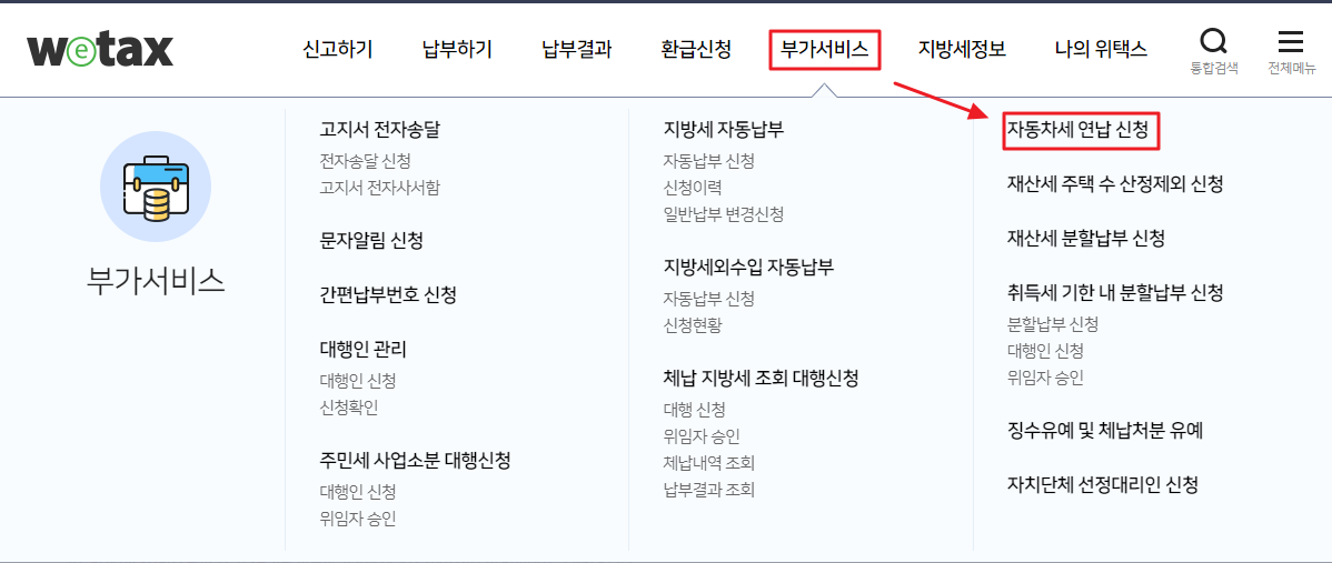 위택스 홈페이지 → 부가서비스 → 자동차세 연납신청
