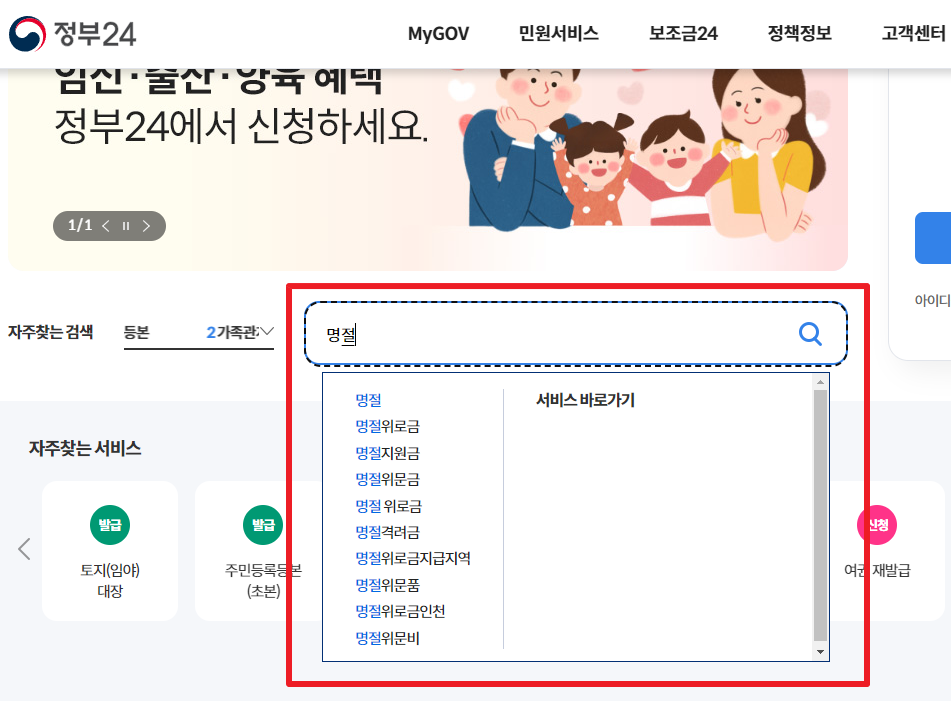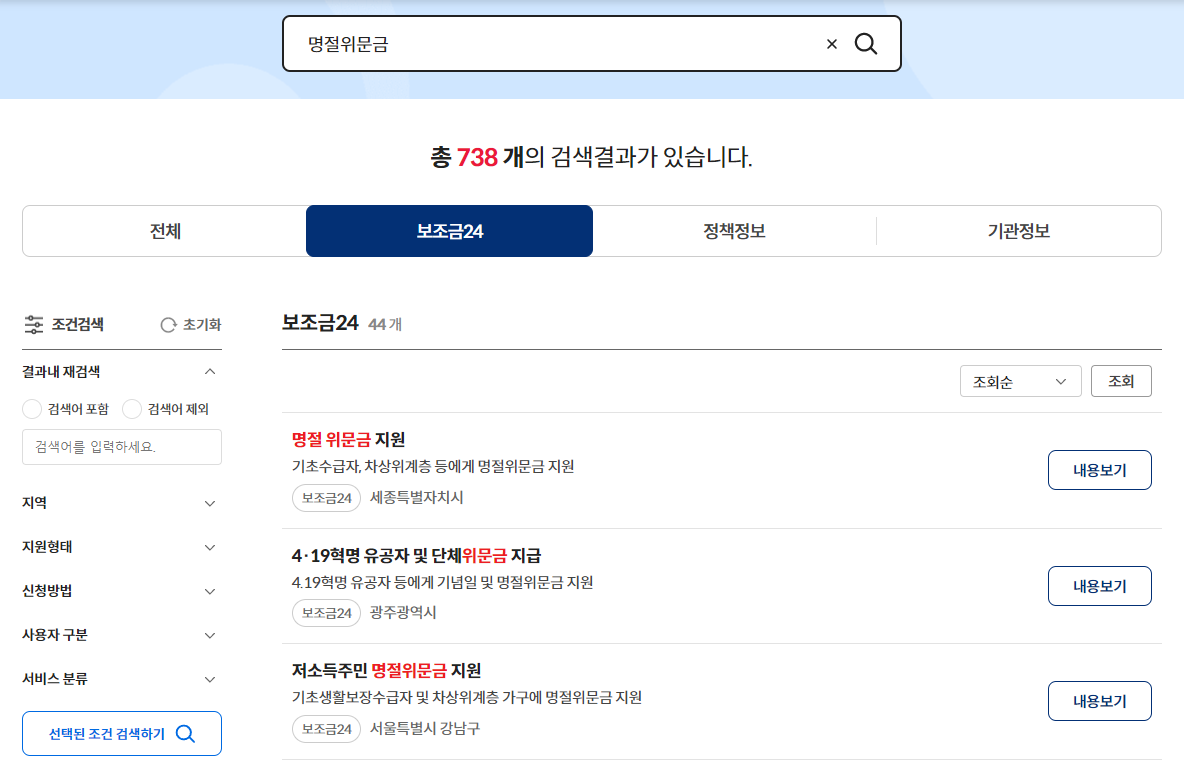 정부24 홈페이지에서 '명절'만 쳐도 연관 검색어가 나오는데 명절위문금, 명절위로금, 명절지원금 등 각 지자체마다 명칭이 달라서 연관 검색어가 여러가지 뜹니다. 저는 검색결과가 더 많은 명절위문금으로 검색하였습니다.